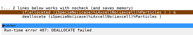 What I was trying to do is to compile the whole module with the /check to look if arrays sizes are violated during the run (and I know now they are because found the bug) but when I compile with /check one of other subroutines starts to complain during the run that DEALLOCATE fails:
