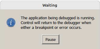 Such warning have to be placed on top of all windows, preferably in yellowish or rozy colors to be noticed, sometimes they can slid under some of multiple windows on a crowded screen and you will spend hell amount of time to understand why Debugger is not responding